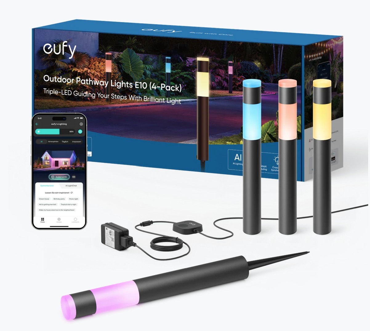 The Eufy Eufy E10 outdoor pathway lights (4-pack) are bollard-style smart lights that can light a pathway, garden, or even use AI-inspired light shows for celebrations like Christmas and Easter.